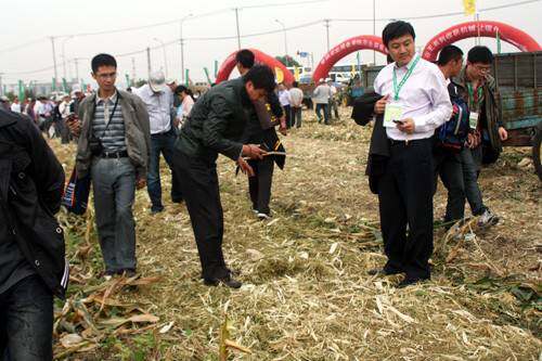 9月25日,在距离沈阳国际会展中心2公里的一块待收获的玉米地前,来自国内外的12台玉米收获机一字排开,按顺序开始收获玉米。这是一场玉米收获机的演示会,更是玉米收获机生产企业间的一场无硝烟的战争。只见收获机过处,参观者纷纷蹲下身子,扒开被粉碎的秸秆,查看机械收获情况。由中国国际农机展主办方举办的这场玉米收获机现场演示会,正值“三秋”时节,迎合了参展观众的心理,吸引了上百观众。