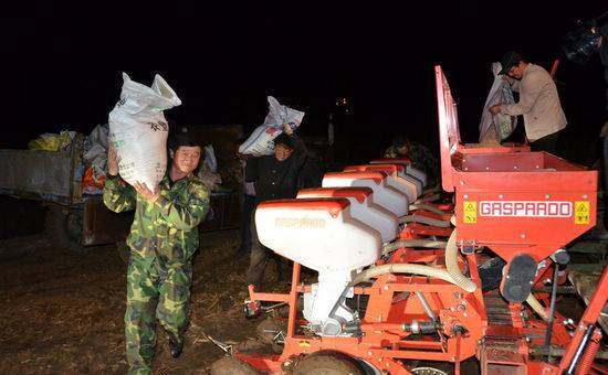 针对当前严峻的春涝形势,延军农场以“抢”字为令,不等不靠,集中机械力量,采取超常规及科学有效的措施,人机齐上,昼夜抢播,确保全场18万亩旱田作物一次播种保全苗,坚决打赢春播战役。图为延军农场职工夜间抢播现场。 李玲 摄