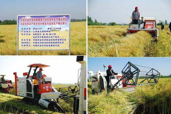 5月11日,正值湖北油菜成熟收获的季节,中国农业科学院油料作物研究所在云梦台湖农场千亩示范基地举行长江中下游油菜全程机械化生产技术现场观摩会。经专家现场测产,全程机械化种植的油菜高产品种“阳光2009”,理论单产达172.6公斤,实际单产可达150公斤以上,每亩直接生产成本由传统种植的1500元左右降低到446.4元,使农民种植油菜由原来每亩亏本750元转而直接赢利300多元,扭转了长江流域近年来油菜生产效率与效益偏低的局面。
